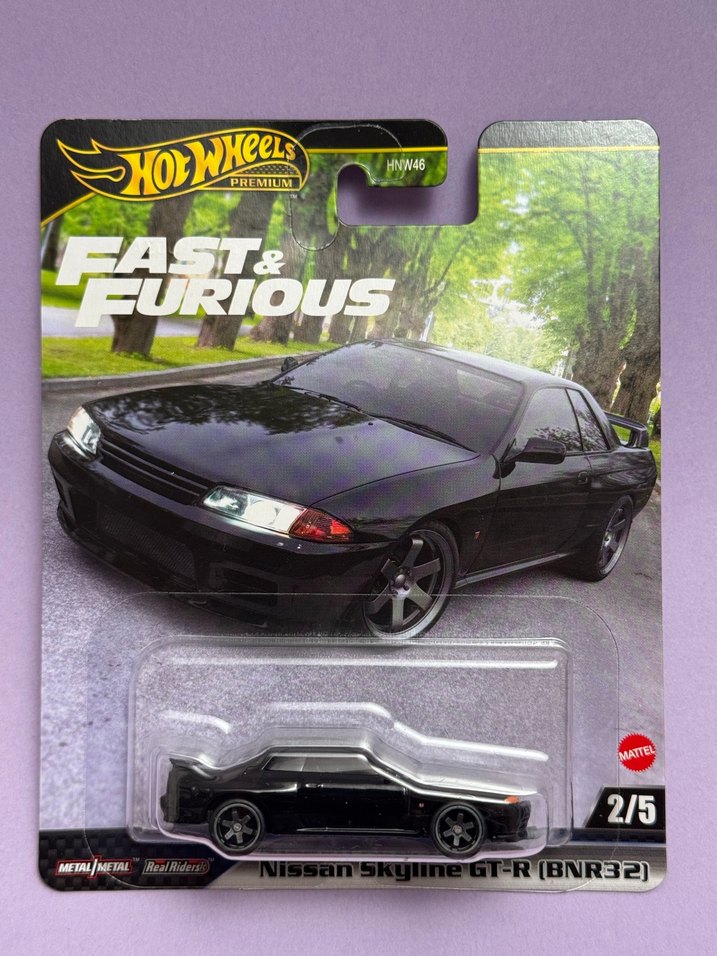 Hot Wheels Fast & Furious serisinden siyah Nissan Skyline GT-R (BNR32) model araba. Metal gövde ve detaylı tasarım içerir.