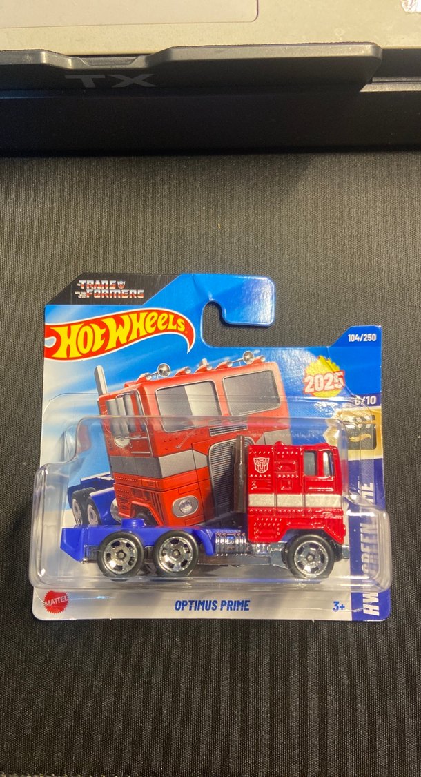 Koyu kırmızı renkte Hot Wheels oyuncak kamyon, yan tarafında OPTIMUSPRIME yazısı bulunur, detaylı tekerlekler ve klasik kamyon formuna sahiptir.