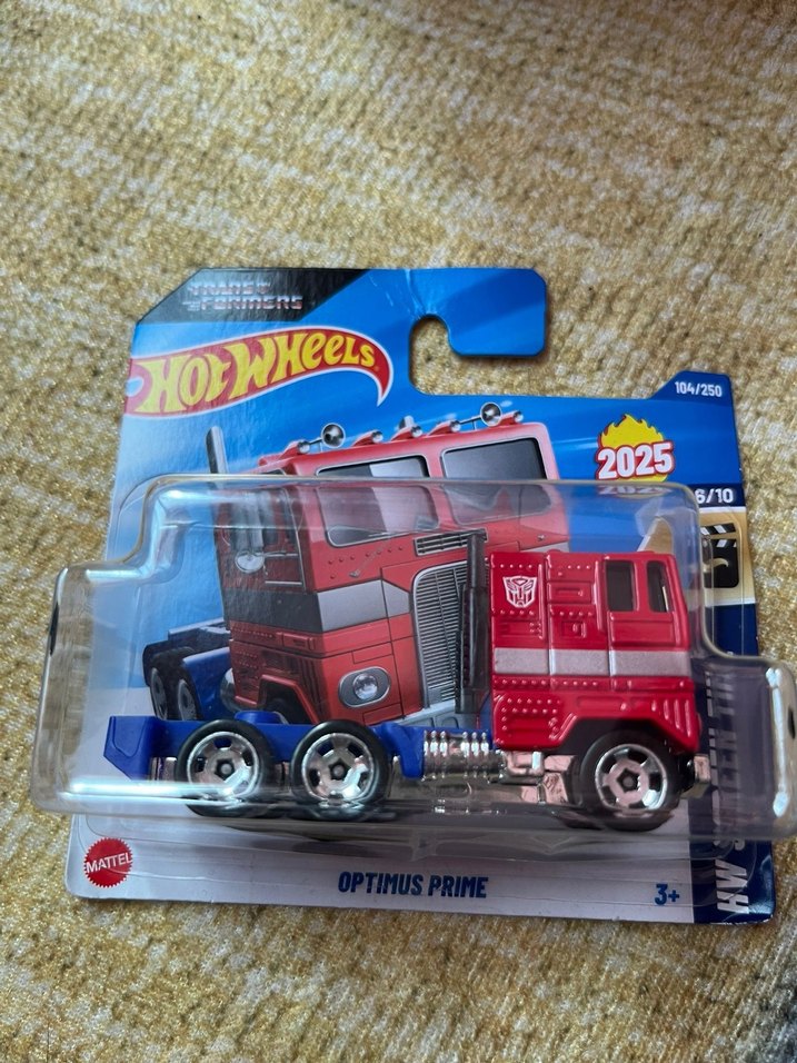 Hot Wheels markalı, renkli kırmızı ve mavi Optimus Prime kamyon oyuncak, detaylı tekerlekli ve 2025 etiketiyle. 3 yaş ve üzeri için uygundur.