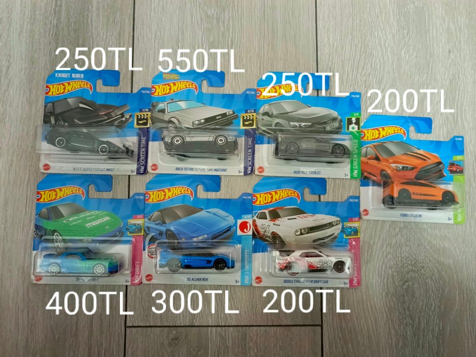 İlanda yer alan Hot Wheels araçlar orijinaldir ve blisterleri hiç açılmamıştır. Araçların kendilerinde herhangi bir kusur yoktur. Sadece kenarlarında bükülmeler olabilir. Beğendiğiniz araçla ilgili detaylı bilgi için yazabilirsiniz. ⚠️ Önemli Bilgi: Tüm araçların kartonet arka yüzlerinde bant izleri bulunmaktadır. Ön yüzler genel olarak temizdir. Araç Listesi: KITT Super Pursuit Mode (Knight Rider) Back to the Future – Time Machine Audi RS e-tron GT Ford Focus RS Mazda RX-7 ’90 Acura NSX Dodge Challenger Drift Car