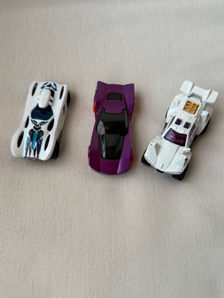 Detaylı tasarımlara sahip beyaz ve mor renkli oyuncak arabalar seti, oyun ve koleksiyon için uygundur.