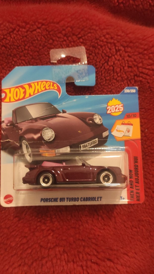 Bu Hot Wheels oyuncak araba, koyu kırmızı renkte 2025 model Porsche 911 Turbo Cabriolet'dir. Detaylı tasarıma ve canlı renge sahiptir. az hasarı var fotoğrafları da var