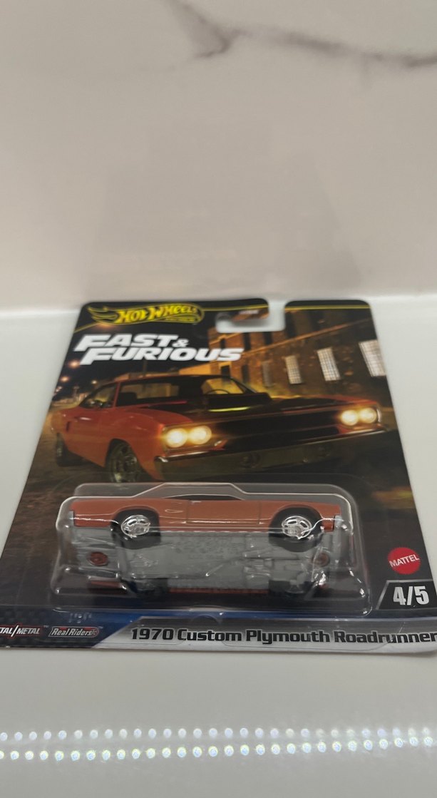 Bu Hot Wheels oyuncak araba, koyu kahverengi 1970 Custom Plymouth Roadrunner tasarımına sahip. Fast & Furious serisinden kötüsü iyi durumda