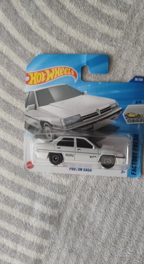 Hot Wheels Proton Saga oyuncak araba, beyaz ve gri renkte detaylı baskılarla. Factory Fresh serisine ait, 3 yaş ve üzeri için uygundur.