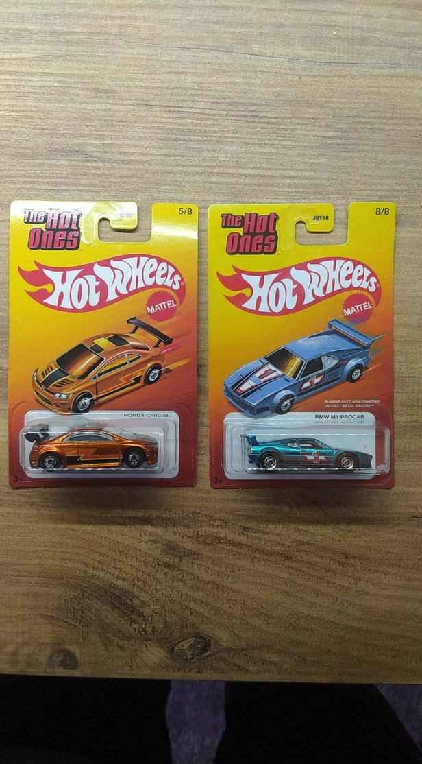 Honda Civic ve BMW M1 Procar modellerinden oluşan, renkli Hot Wheels oyuncak araba seti.