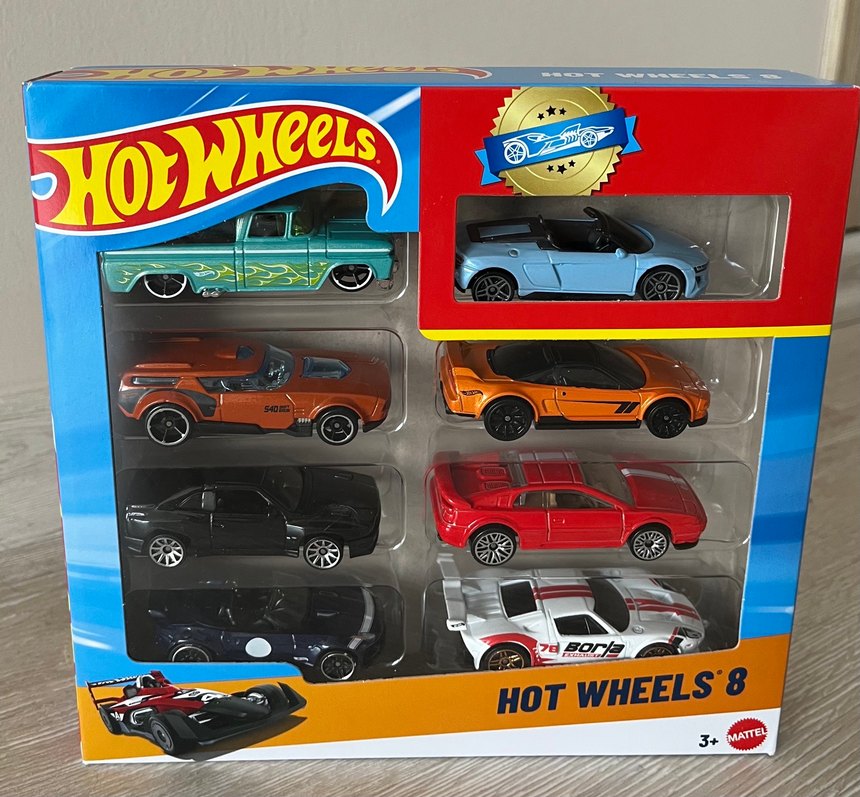 Hot Wheels markalı, çeşitli renk ve modellerde sekiz adet oyuncak araba seti.