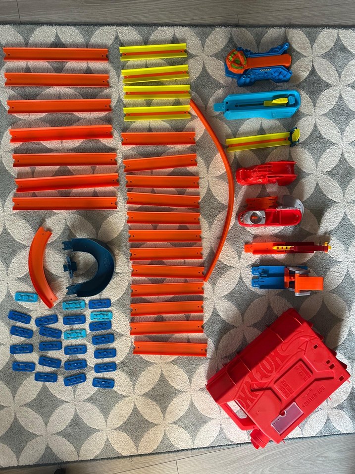Kavisli ve düz parçalar, fırlatıcılar ve bağlantı elemanları içeren renkli oyuncak araba yarış pisti seti. ️