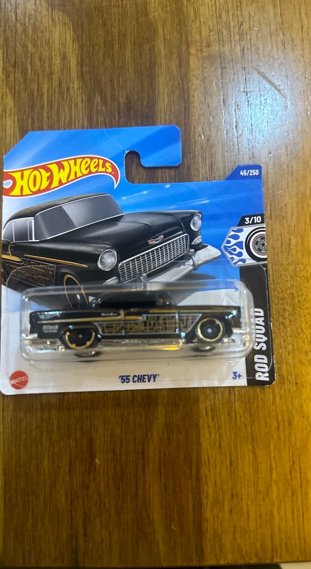Hot Wheels tarafından üretilen siyah renkli '55 Chevy oyuncak araba, Rod Squad serisine ait detaylı tasarıma sahiptir.