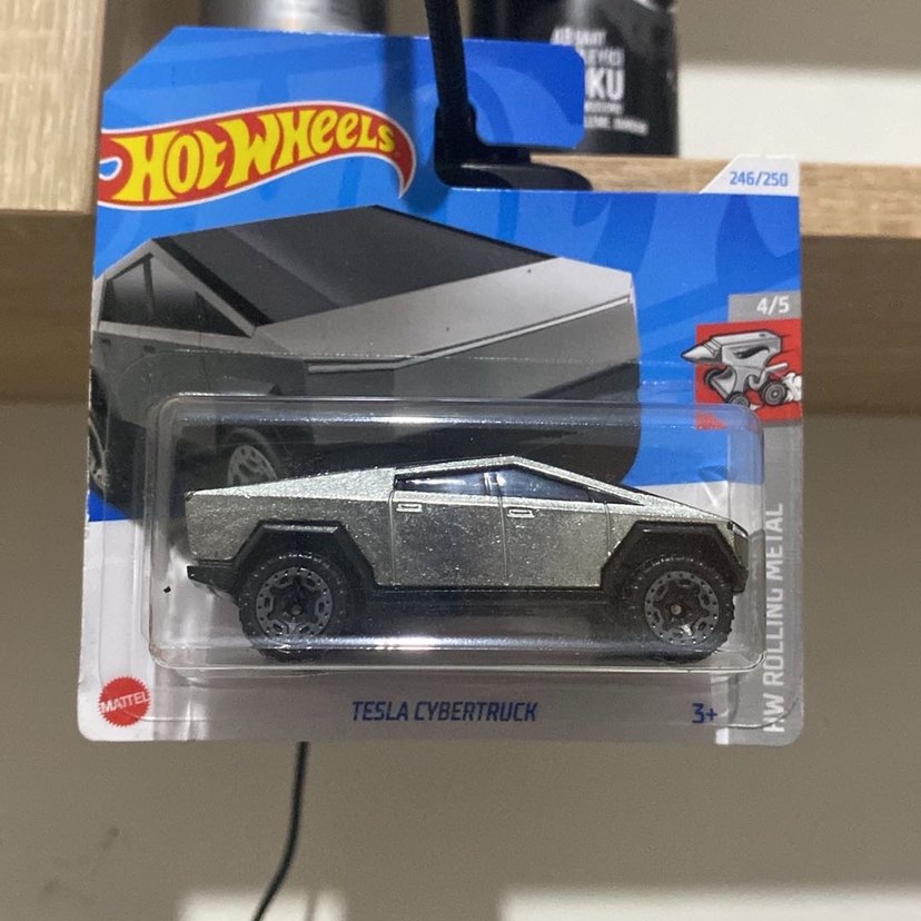 Hot Wheels Tesla Cybertruck oyuncak araba, gri renkte ve metal hareketli parçalar içerir. Model numarası 246/250, 4/5 puanlıdır.