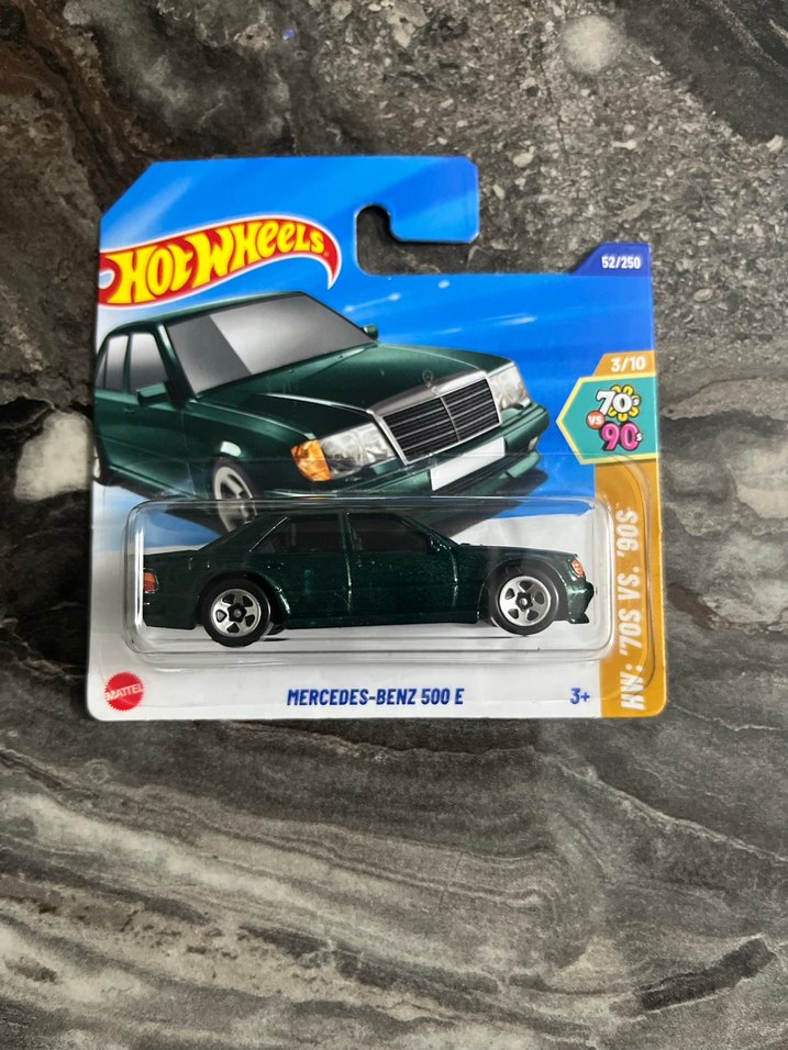 Koyu yeşil Hot Wheels oyuncak araba, Mercedes-Benz 500 E modelidir. Detaylı tasarım ve pürüzsüz tekerleklerle oyun için uygundur. 3 yaş ve üzeri için.