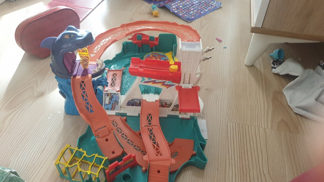 Renkli ve çok parçalı oyuncak seti, çeşitli rampalar ve kapılar içerir. Etkileşimli oyun için çok sayıda parça sunar. hot wheels