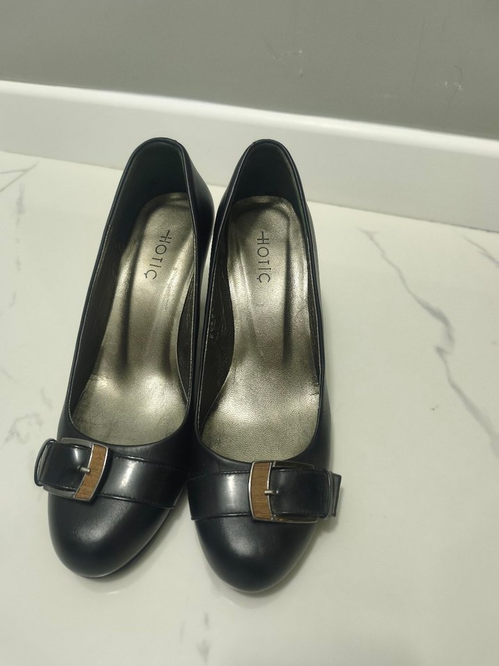 Siyah, tokalı ve kalın topuklu kadın stiletto. Kauçuk malzemeden parlak görünümlü, klasik ofis şıklığı için uygun.