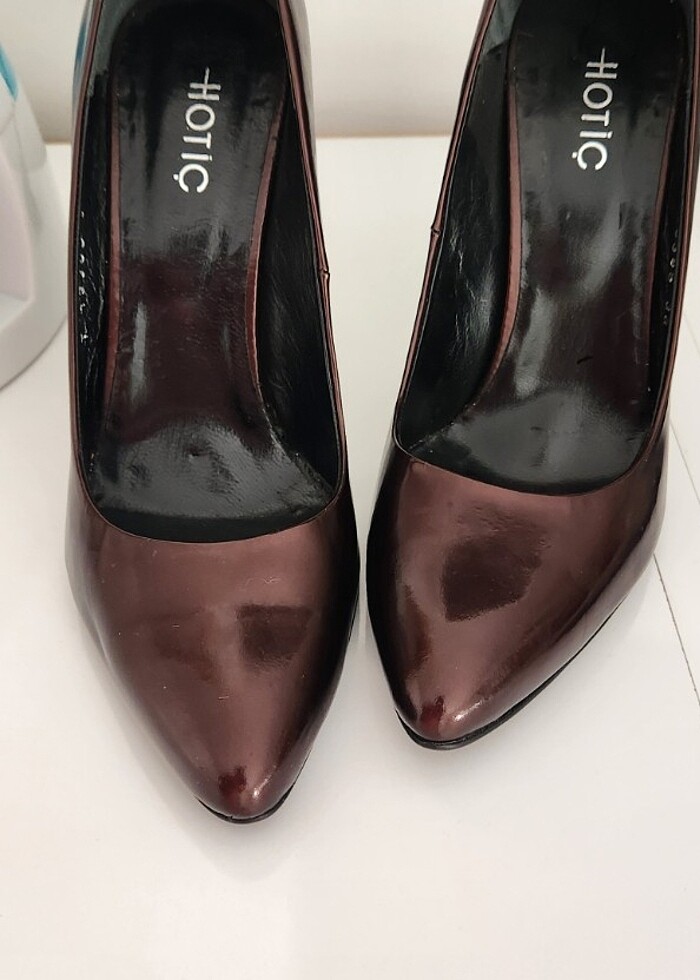 Hotiç marka 38 numara sadece bir kez ev içinde giyilmiş ayakkabı.ince topuk.bordo renk.Silindiği bezden dolayı bazı yerlerinde hafif bulanıklık var.Fotoğraflarda belli.