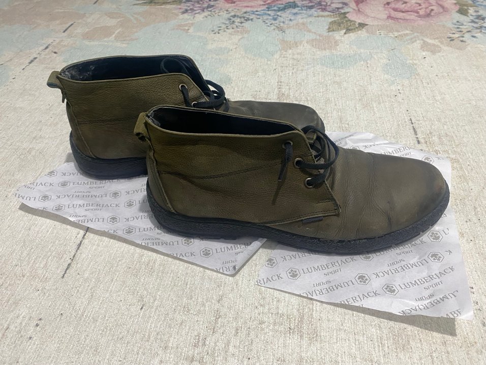 Lumberjack markalı, tokalı detaylara sahip, haki renkli deri erkek bot. Sokak stili ve günlük kullanım için uygundur. Desensiz ve gri tonludur.