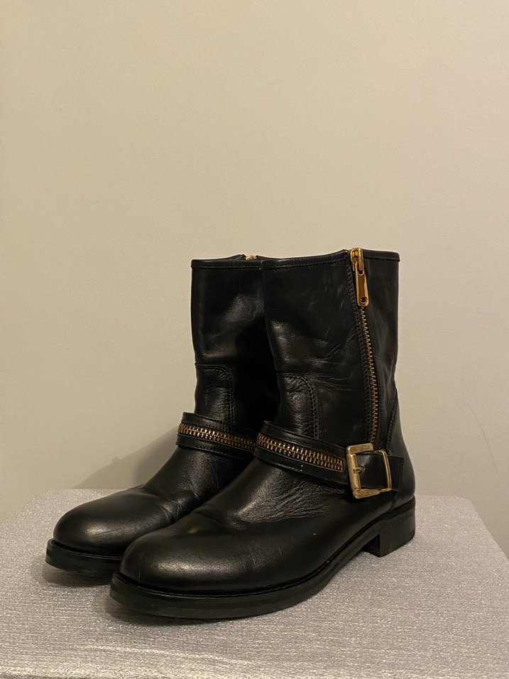 Kemer detaylı, yılan desenli siyah deri biker botlar. Blok topuklu, günlük kullanıma uygun, trend casual tarzında.