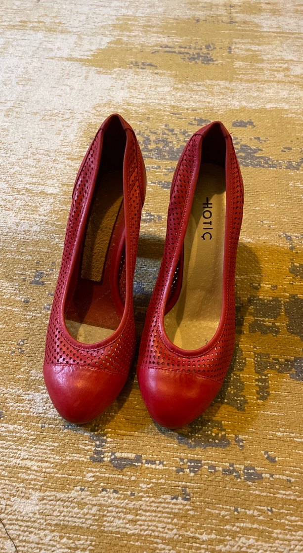 Kırmızı deri, tok topuklu, tokalı ve parlak yüzeyli stiletto. Hafif delikli detaylar bulunur. Marka: HOTIC.