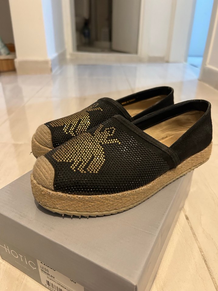 Hotiç marka 38 numara kadın espadril. Kullanıma bağlı tabanlarında renk değişimi mevcut fotoğraflarda zaten ekledim. Oldukça rahat günlük kullanıma uygun bir ayakkabı çok kullanmadım.