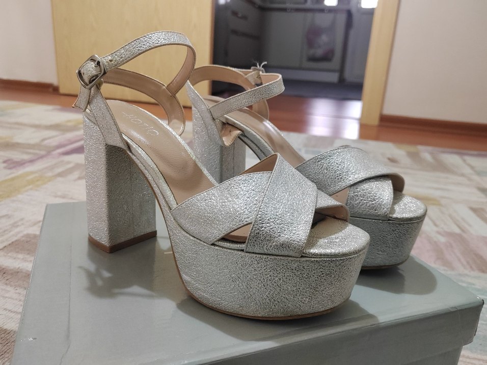 Gri deri, yılan derisi deseni ve tokalı bantlı platform topuklu kadın abiye ayakkabılar. Klasik zarafet ve modern stil sunar. Düğün ve özel günler için uygun. Sadece gelin ayakkabısı olarak kullandım. Fazlasıyla rahat bir ayakkabı Son görselde soldaki tekin başparmağa denk gelen kısmında sadece hafif renk atması var. Onun dışında görülür bir defosu yok.
