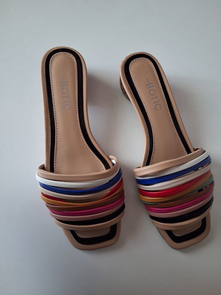 Blok topuklu, renkli çizgili pileli tasarıma sahip kadın terlikler. 3200 TL sıfırı ki bu ürün sıfırdan farksızdır diğer ürünlerle alımlar da indirim olacaktır