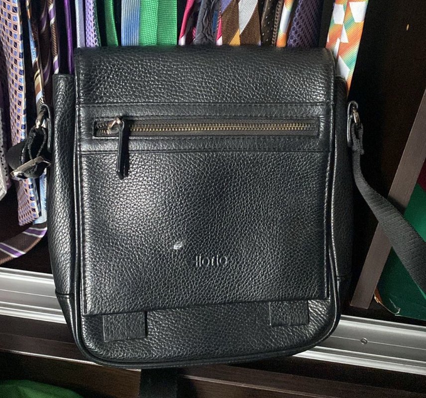 Deri dokulu, fermuarlı ön cepli siyah erkek omuz çantası. İş ve biker tarzlarına uygun.