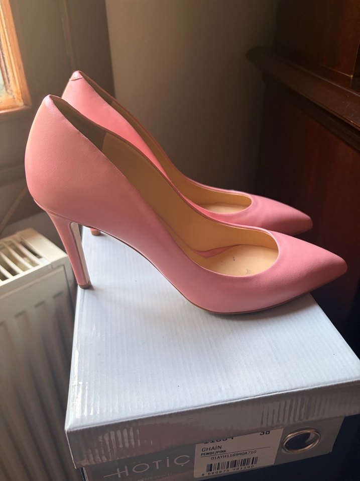 Pembe renkli, silikon malzemeden üretilmiş stiletto topuklu kadın ayakkabısı. Minimalist ve desen içermeyen tasarımıyla ofis için uygundur. 1-2 kez giyildi fiyata yansıttım. Orijinal kutusunda gönderdim yapılacaktır. İade yoktur