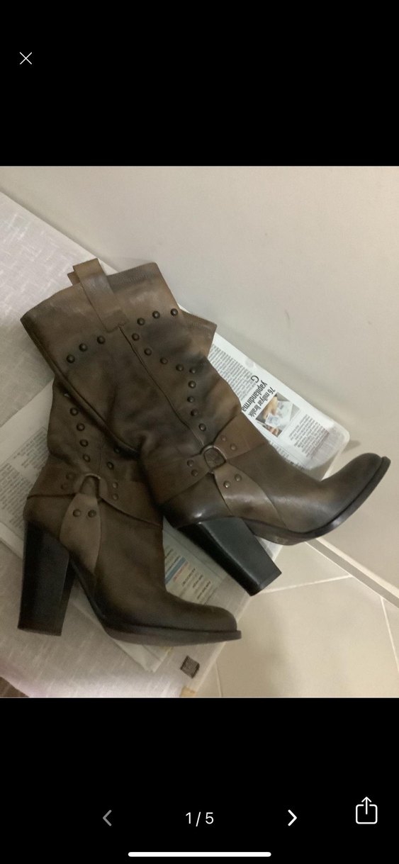 Toplasan 4-5 kez giyildi… Artık home office çalıştığım için giyemediğimden dolapta dursun istemiyorum. Kahverengi deri dizüstü çizmeler, blok topuklu ve tokalı detaylara sahip. Vintage bohem tarzıyla günlük kullanıma uygun, desenli tasarım sunar.
