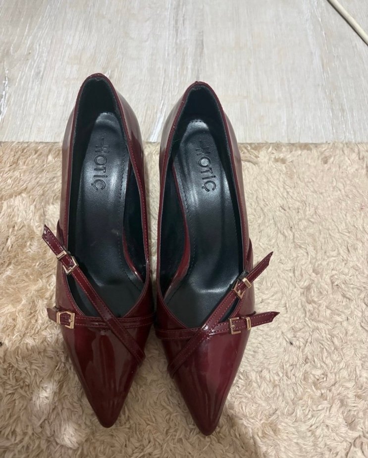 Bordo stiletto topuklu, tokalı ve kauçuk malzemeden yapılmış, ofis için uygun kadın ayakkabısı. Hotiç marka temiz