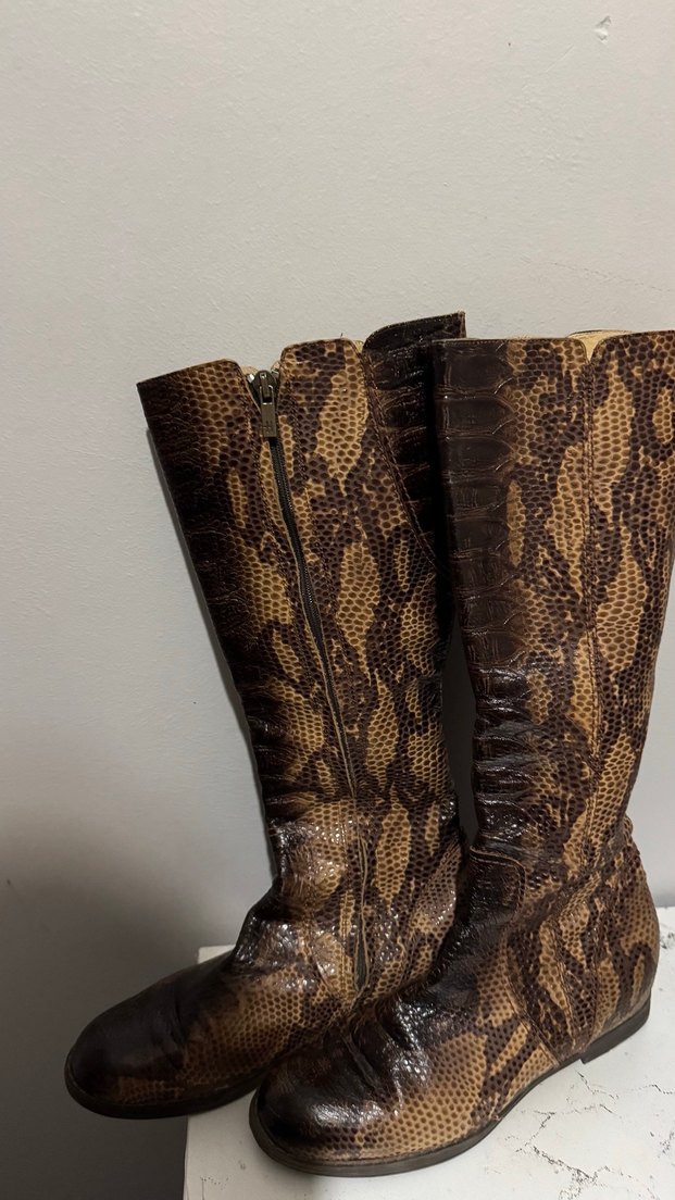 Kahverengi deri yılan desenli diz boyu çizme. Hotiç markadır. Çok şık ve asil duruyor. 37 numara fakat enine dar bir çizme. Dış yüzeyinde hiçbir deformasyon yoktur fakat iç deri yüzeyinde yırtılmalar mevcuttur. Görsellere ekledim.