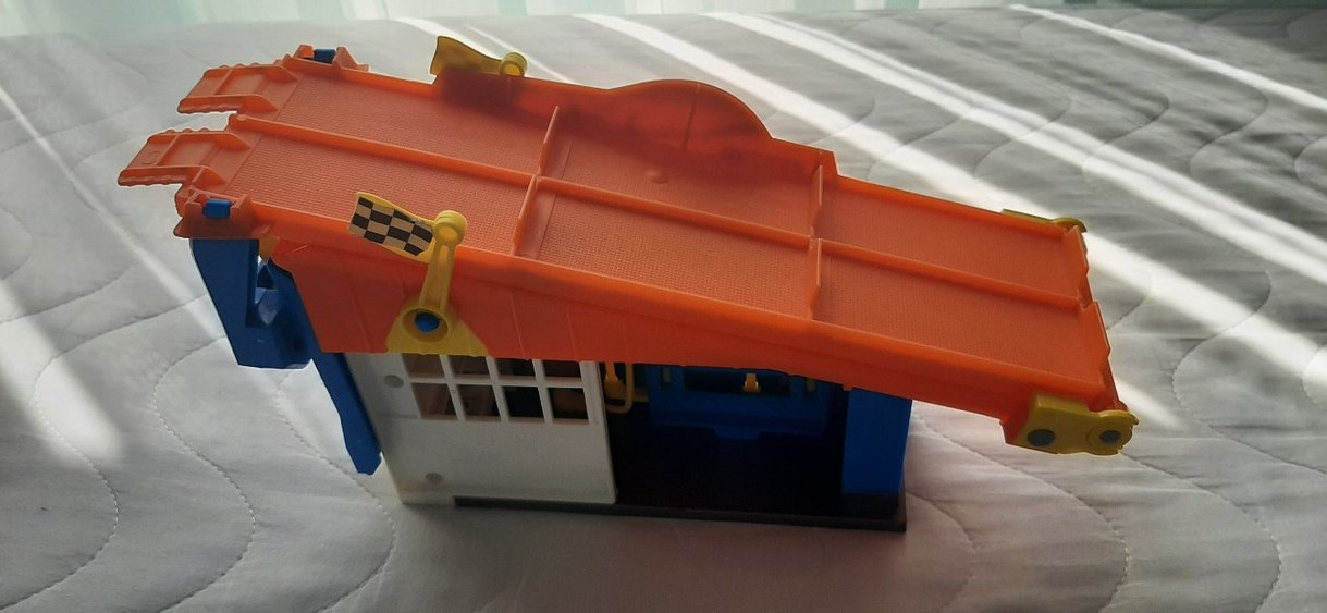 Canlı turuncu gövde ve sarı detaylara sahip renkli oyuncak araba, hayal gücünü destekler.