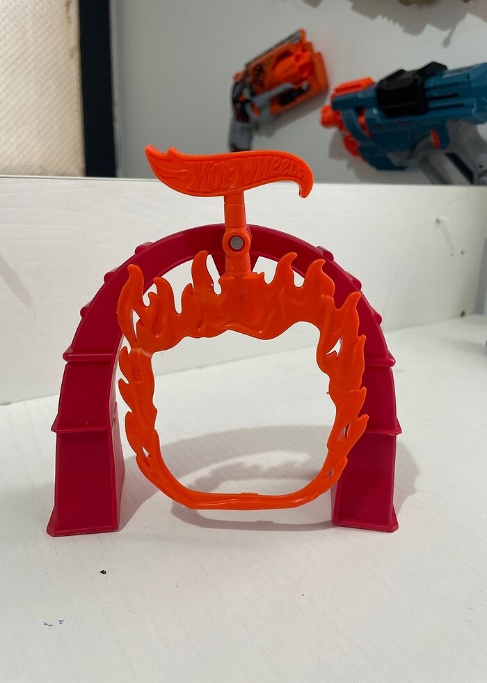 Fırlatma rampası olan çocuklar ateş çemberinin içinden araba geçiriyor. Hotweels serisi olan çocuklar için koleksiyonlukta olabilir