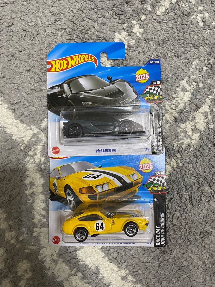 Sarı renkli 64 numaralı ve koyu renkli iki Hot Wheels oyuncak araba, 2025 koleksiyonuna ait. Tanesi 530 tldir ikisi 1000 tl