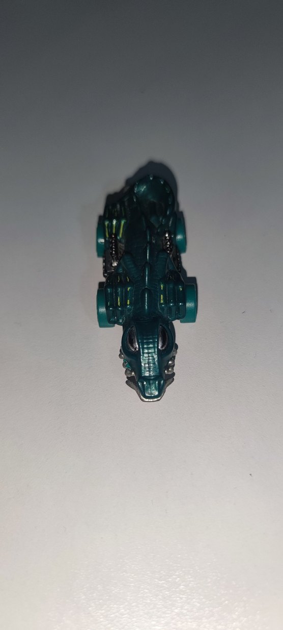 Koyu turkuaz renkte, timsah şeklinde detaylı dokulu ve dört tekerlekli oyuncak araba.