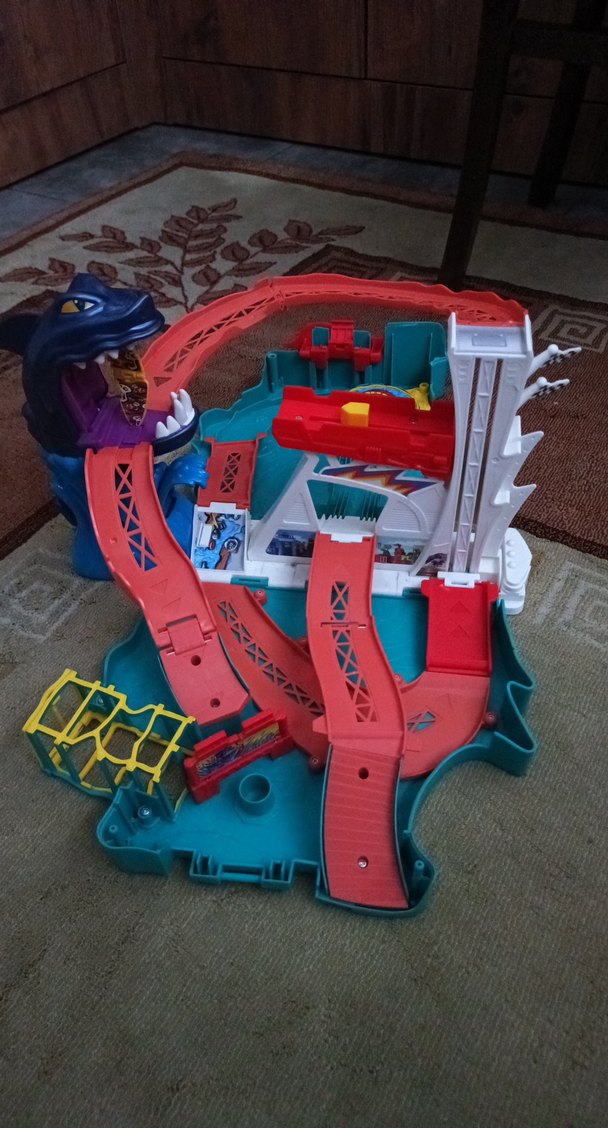 Çok renkli dinozor temalı oyuncak parkurunda çok sayıda rampa ve etkileşimli parçalar bulunur. Oyuncak arabalar için çeşitli yollar mevcuttur. hiç bir sikintisi yok