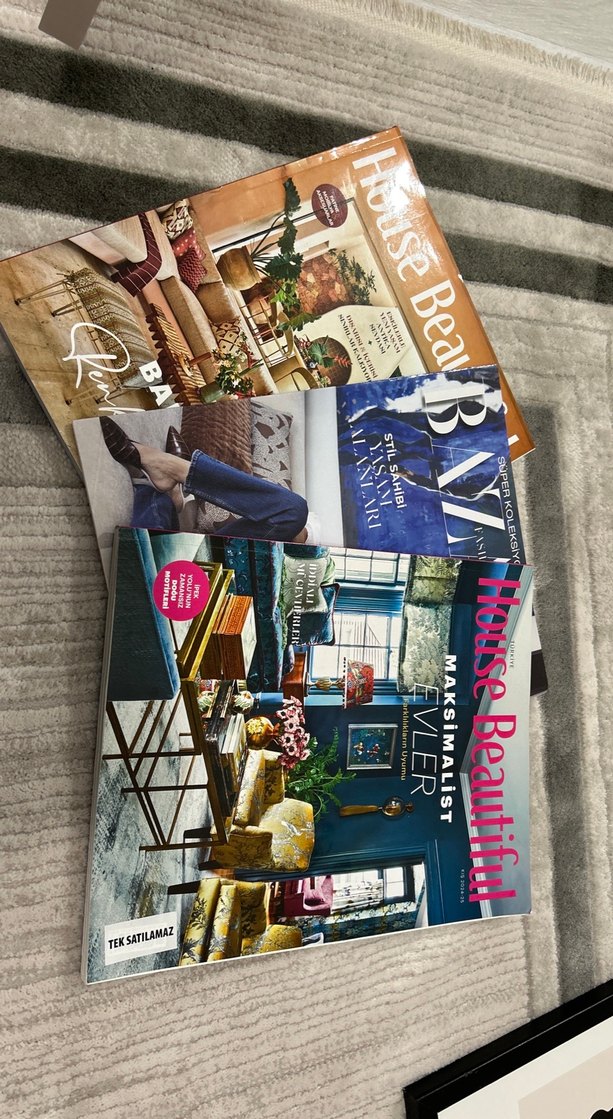 House Beautiful dergisi seti, iç tasarım ve dekor fikirleri sunar. Her sayı şık yaşam alanları ve tasarım ilhamı içerir. Dekoratif kullanmıştım