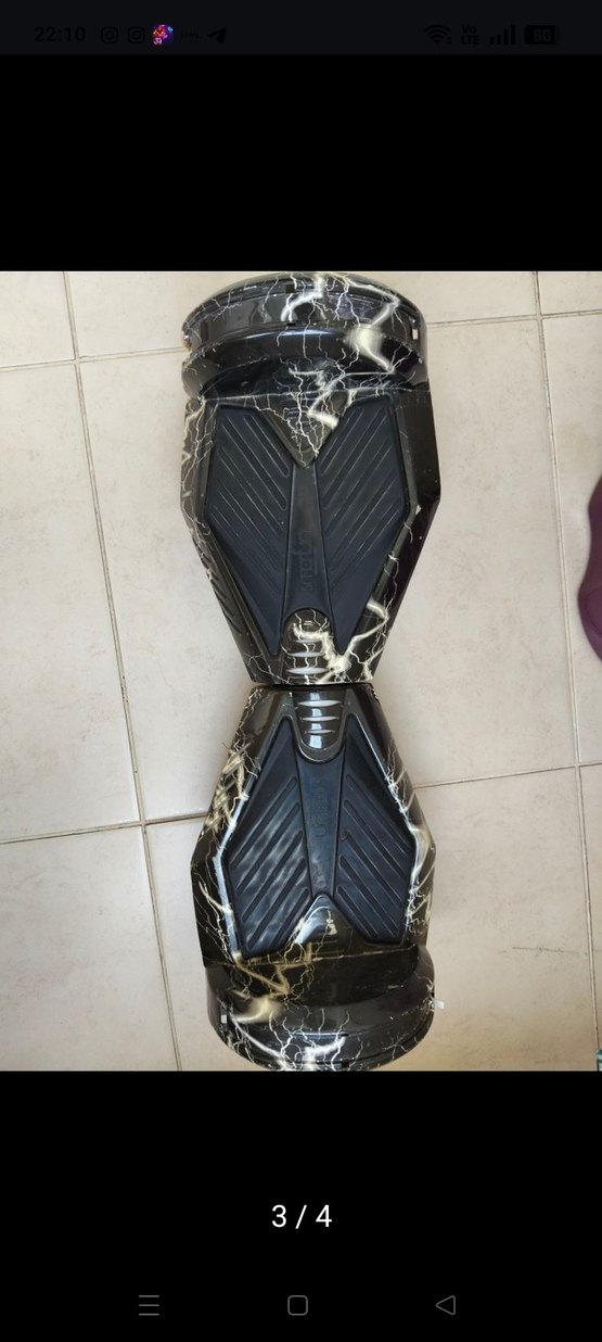 Siyah, mermer desenli çocuk scooterı, kaymayı önleyen dokulu ayak pedleri ile donatılmıştır.