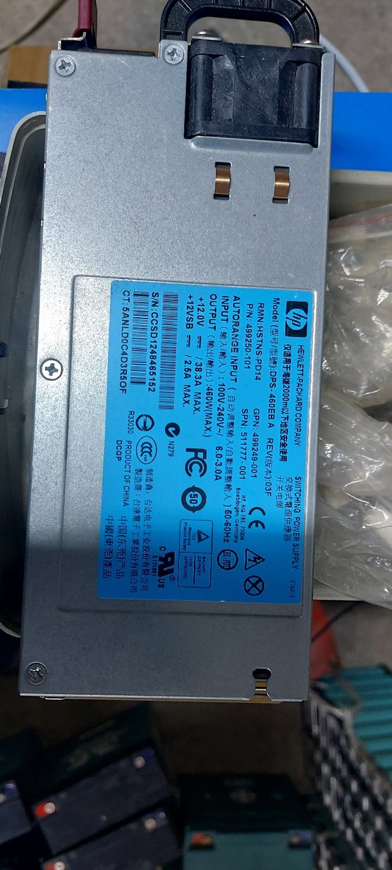 HP marka, maksimum 460W çıkış gücüne sahip güç kaynağı ünitesi. Model HSTNS-PR04, çeşitli voltaj çıkışları ve güvenlik sertifikaları bulunur.