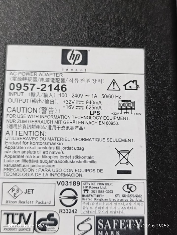 HP marka siyah AC güç adaptörü, 100-240V 1A giriş ve +32V 940mA, +16V 625mA çıkış değerlerine sahiptir. Bilgisayar ekipmanları için uygundur. ⚡