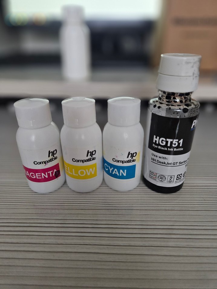 HP serisi için uyumlu magenta, sarı, camgöbeği ve siyah mürekkep şişeleri seti. siyah yarisina kadar dolu diger renkler 3/2 si doludur.