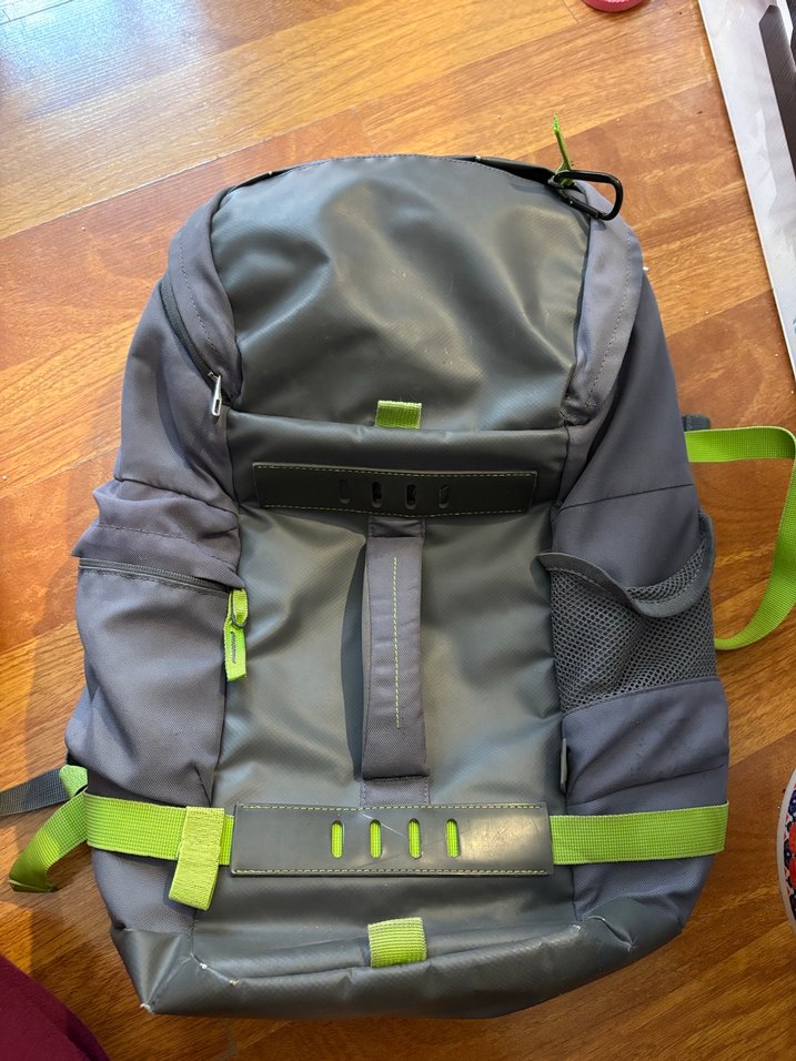 Yeşil detaylı, tokalı gri kadın sırt çantası. Spor ve sokak stiline uygun, desen içermeyen sentetik kumaştan yapılmıştır. Kusurları mevcuttur. Üst küçük cebin fermuarının yapılması gerekiyor