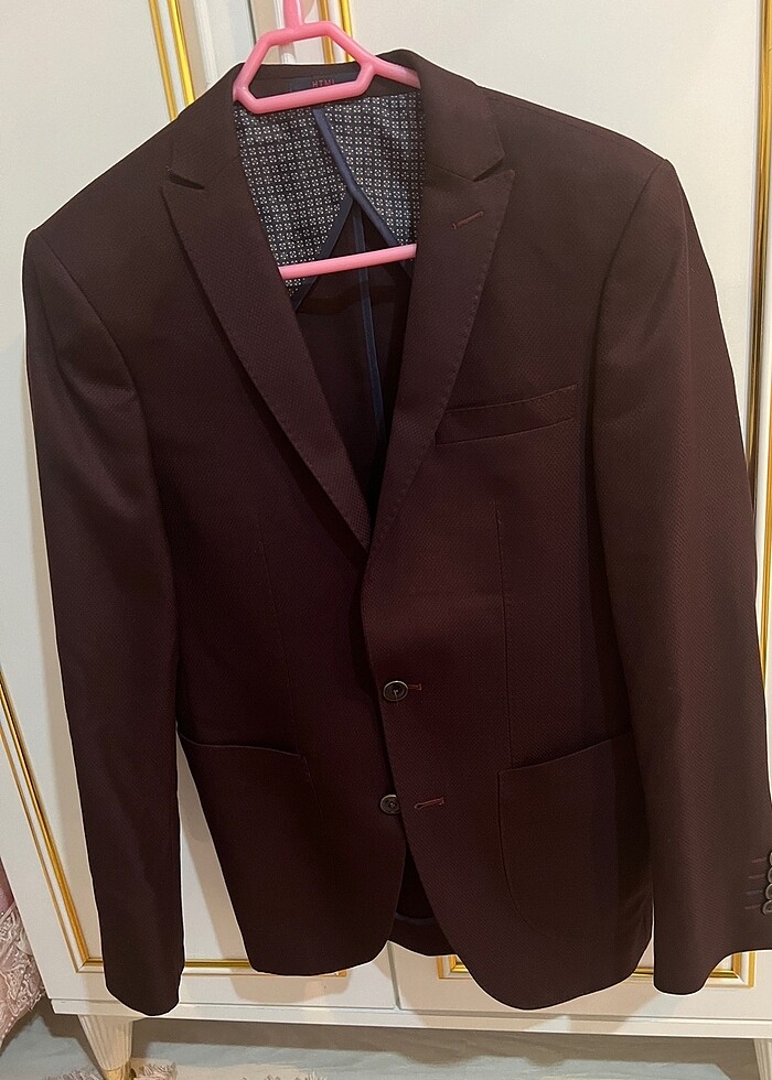 Gömlek yok içinde sadece pantolon ceket ve kravat rengi morla bordo arası
