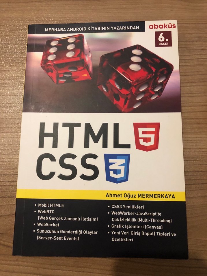 Ahmet Oğuz Mermerkaya'nın HTML5, CSS3, WebRTC, WebSocket, Sunucunun Gönderdiği Olaylar ve Grafik İşlemleri gibi konuları içeren kitabı. Kitapta 10 sayfa kadar fosforlu kalemle satır işaretlemeleri hariç tertemiz yırtığı vs yok