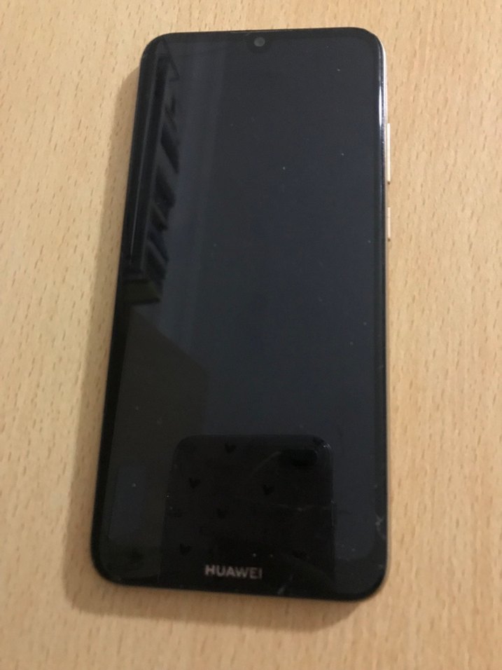 Ön kameralı, koyu ekranlı ve bej renkte Huawei Android telefon.
