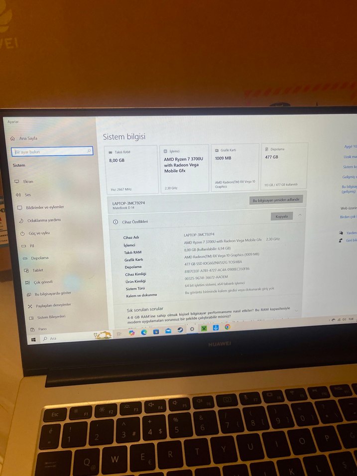 Camel renkli laptop, AMD Ryzen 7 3700U işlemci, Radeon Vega Mobile grafik, 8GB RAM ve 477GB depolama alanına sahiptir. Ekranda sistem bilgileri görüntülenmektedir. Formatlanıp, şarj aleti ve kutusuyla birlikte teslim edilecektir.