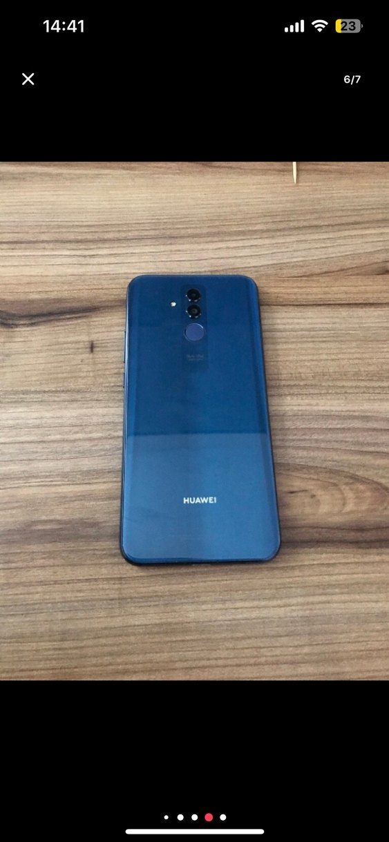 Bu HUAWEI Android telefon koyu mavi renkte olup, çift arka kamera ve altında parmak izi okuyucuya sahiptir. 64 gb