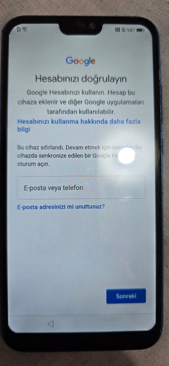 Huawei p20 lite telefonu hesaptan çıkış yapmadan resetledik hesabı unuttuk giriş yapamıyoruz bu şekilde satlık