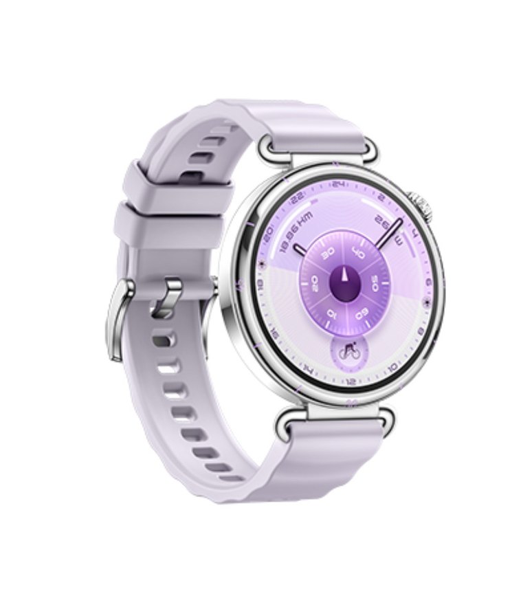 Pastel mor renkte, yuvarlak ekranlı ve ayarlanabilir kayışa sahip akıllı saat. ⌚