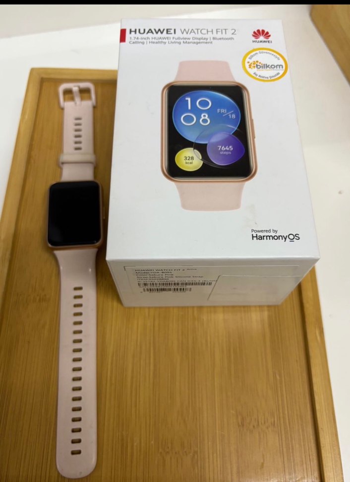 Huawei Watch Fit 2, bej renkte, canlı ve hafif ekranlıdır. HarmonyOS işletim sistemi, Bluetooth ve sağlık yönetimi özellikleri bulunur. Şarj kablosu dahil