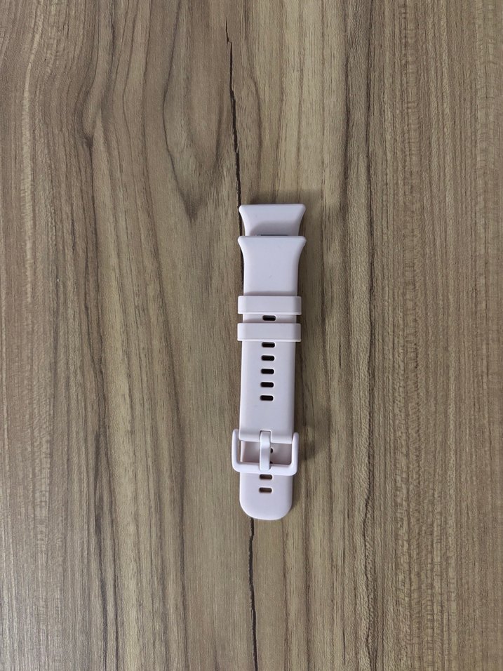 Ayarlanabilir delikli ve metal tokalı açık bej akıllı saat kayışı, yumuşak malzemeden üretilmiştir.⌚