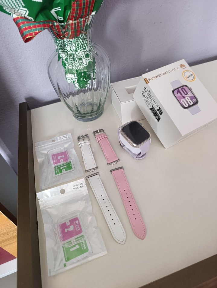 Huawei Watch Fit akıllı saat, açık pembe kayış ve ek beyaz ile pembe kayışlar içerir. Ekran koruyucular ve orijinal kutu mevcuttur. ⌚ garantisi devam ediyor 05.2027 ye kadar