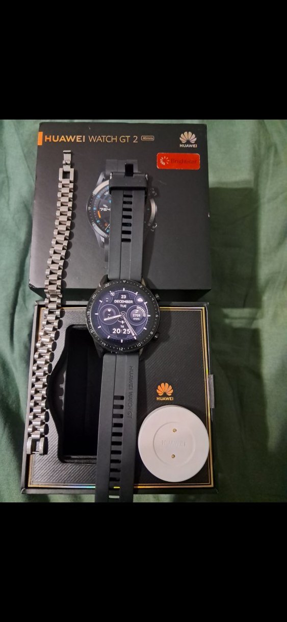 Huawei Watch GT 2, siyah renkte, siyah silikon kayış. Kablosuz şarj desteği mevcuttur ihtiyaç fazlası olduğu için satmaktayım ekranın üstünde çok belli olmayacak şekilde bazı çizikler mevcut son resimde belli olduğu kadarıyla gösyermeye çalıştım fakat bu çizikler sorun teşkil edecek türde değildir.Kablosunu çekmeyi unutmuşum o da mevcut((Bileklik hediyedir)) :). ⌚⌚️⌚️